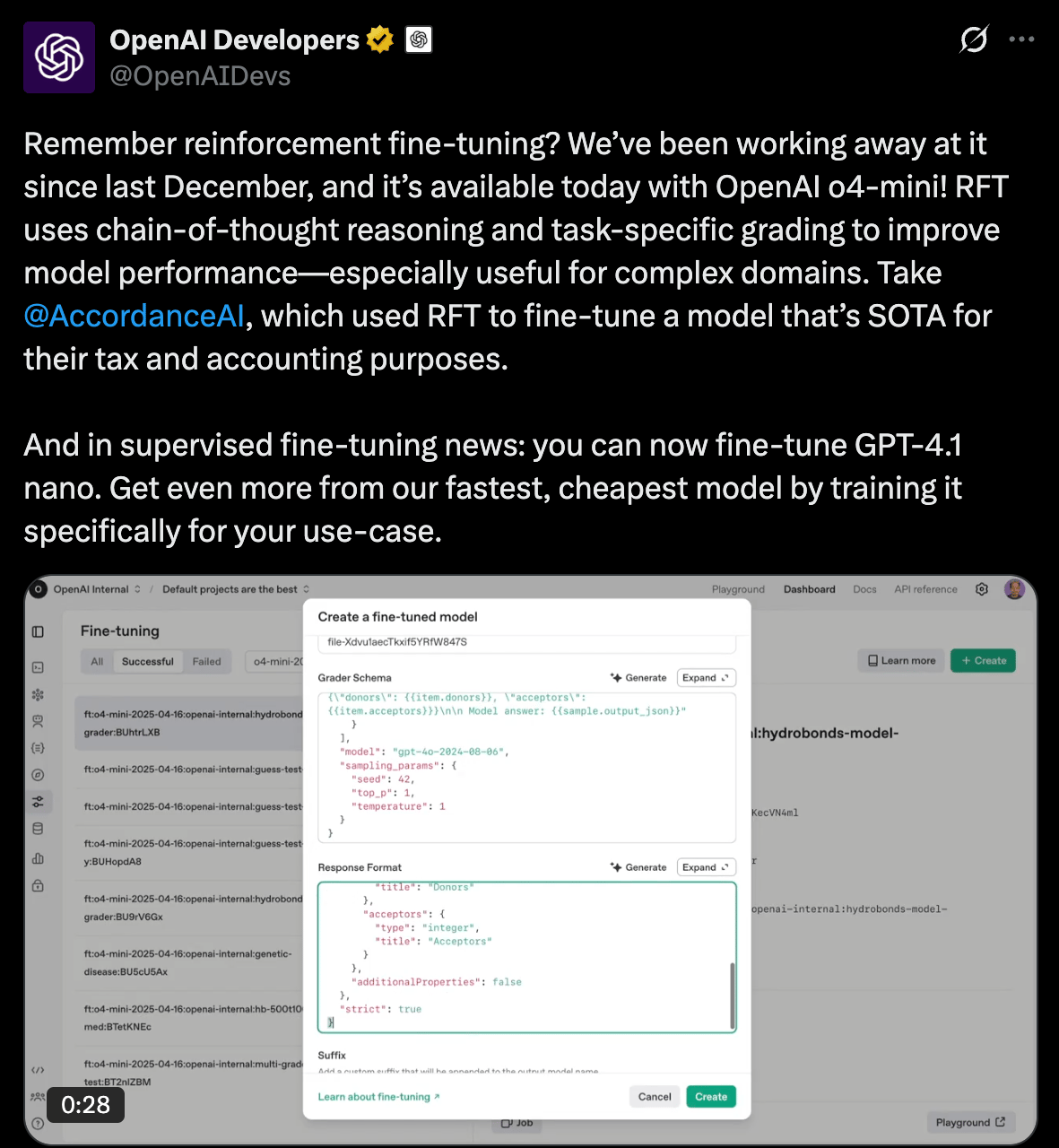 Okay, this is something I personally am pretty excited about and I think might have flown under-the-radar so I’m guessing a lot of people didn’t even know it happened. If you don’t know what reinforcement fine-tuning is, that’s okay - the OpenAI Developers account on X shared a pretty solid video of it in action, along with a little roundtable discussion with the OpenAI crew about it.